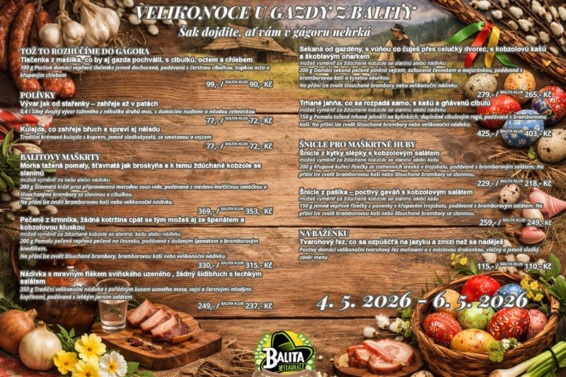 Srdečně Vás zveme na Velikonoční hody do restaurace BALITA! Přivítejte s námi jaro skvělým a výjimečným jídlem, které jsme pro Vás připravili a pojali je tak trošku Valašsky. Tentokrát jsme se zaměřili nejen na špičkovou kvalitu masa a mimořádně kvalitní přípravu jednotlivých jídel, hlavně však na tradiční pojetí akce.